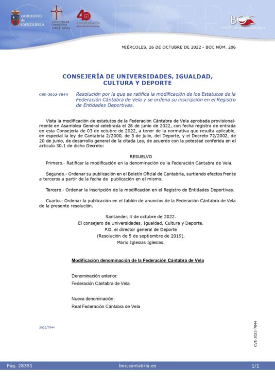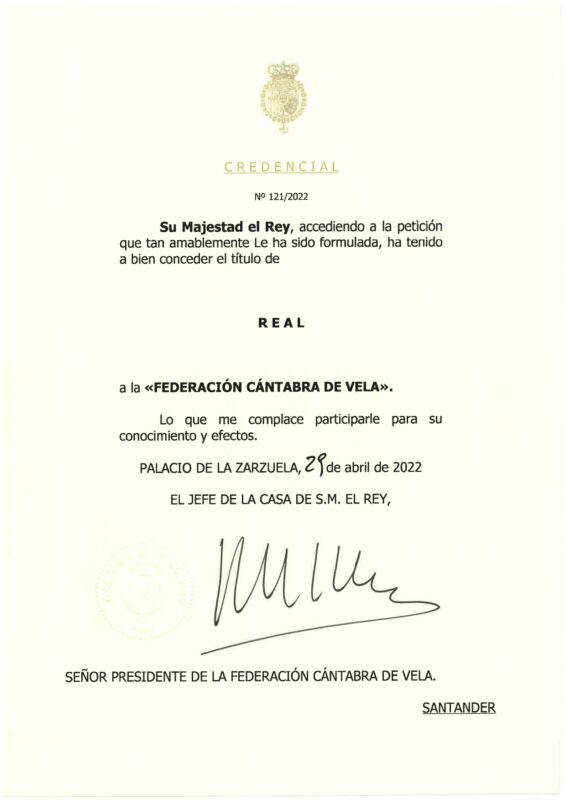 Tal y como publica el boletín oficial de Cantabria y acredita la Credencial, le ha sido otorgado el título de Real a la, ahora, Real Federación Cántabra de Vela.