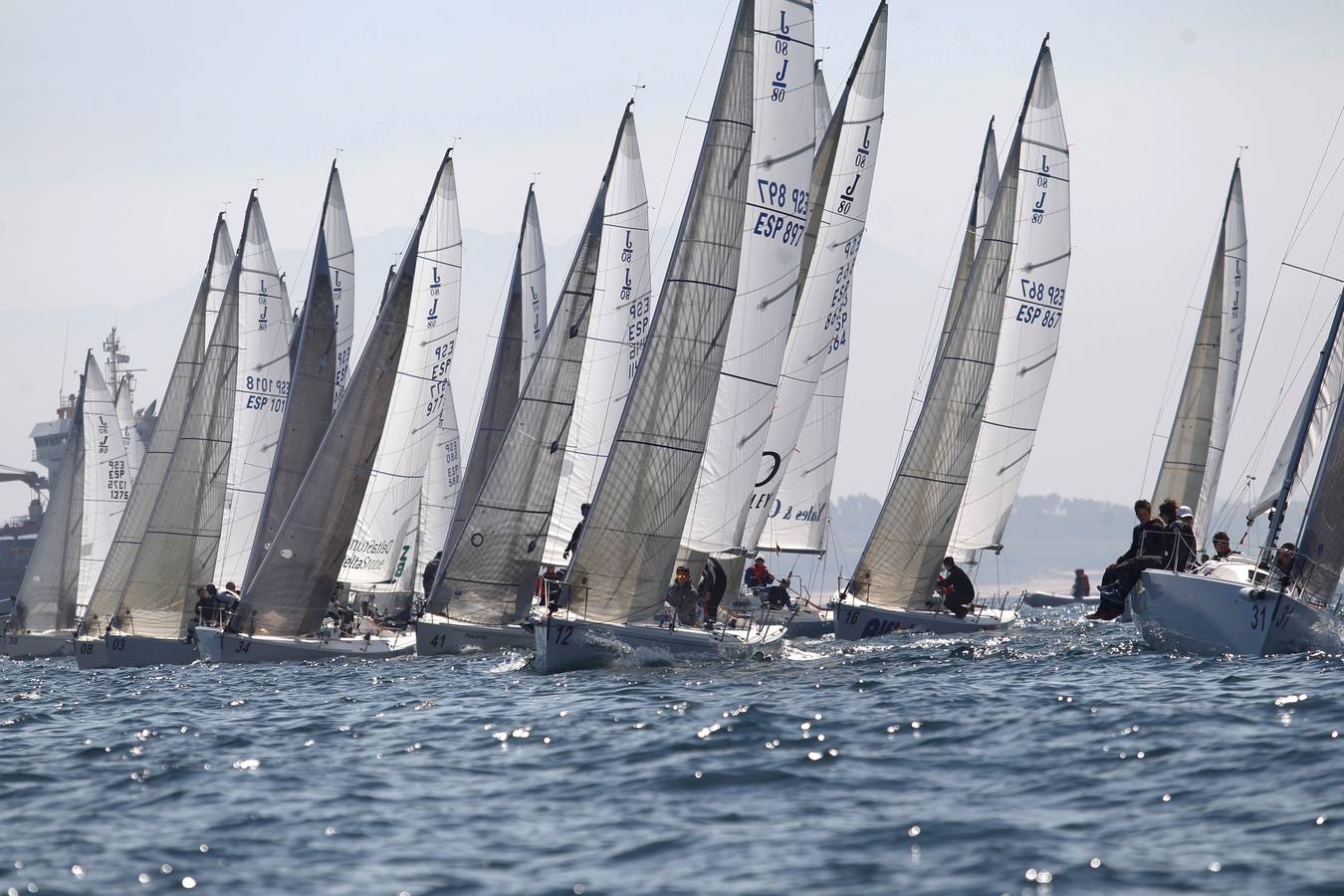En la primera regata, tras una primera salida anulada, valió la segunda. Tras el campanazo la flota se dividió claramente en dos grupos, uno de ellos se dirigió hacia el bordo de la izquierda (sur), y el otro hacia el norte. Los primeros en montar la baliza de barlovento fueron los que eligieron el bordo norte, ya que aprovecharon mejor la marea a favor durante la ceñida, y consiguieron coger una buena rolada hacia la derecha al final de ese tramo. Fue el ‘Narena’, de Nicolas Merino, que reaparecía en la cancha con Jesús Amaliach al timón, el que tuvo el honor de pasar la primera baliza en cabeza, seguido muy de cerca por ‘Verigüeto’, ‘Maqueché’, ‘Trig Money’ y ‘Kia’. Nada más montar la baliza Ignacio Camino (Trig Money) decidió trasluchar hacia el Norte y con una impresionante planeada consiguió ponerse al frente de la flota y cerrar en cabeza la primera empopada con gran ventaja, seguido por ‘Maqueché’ y ‘Kia’, que patroneaba Santi López-Vázquez, a los que seguían un grupo formado por ‘Punto Arquitectura’, ‘Verigüeto’, ‘Narena’ y ‘Central Óptica’.