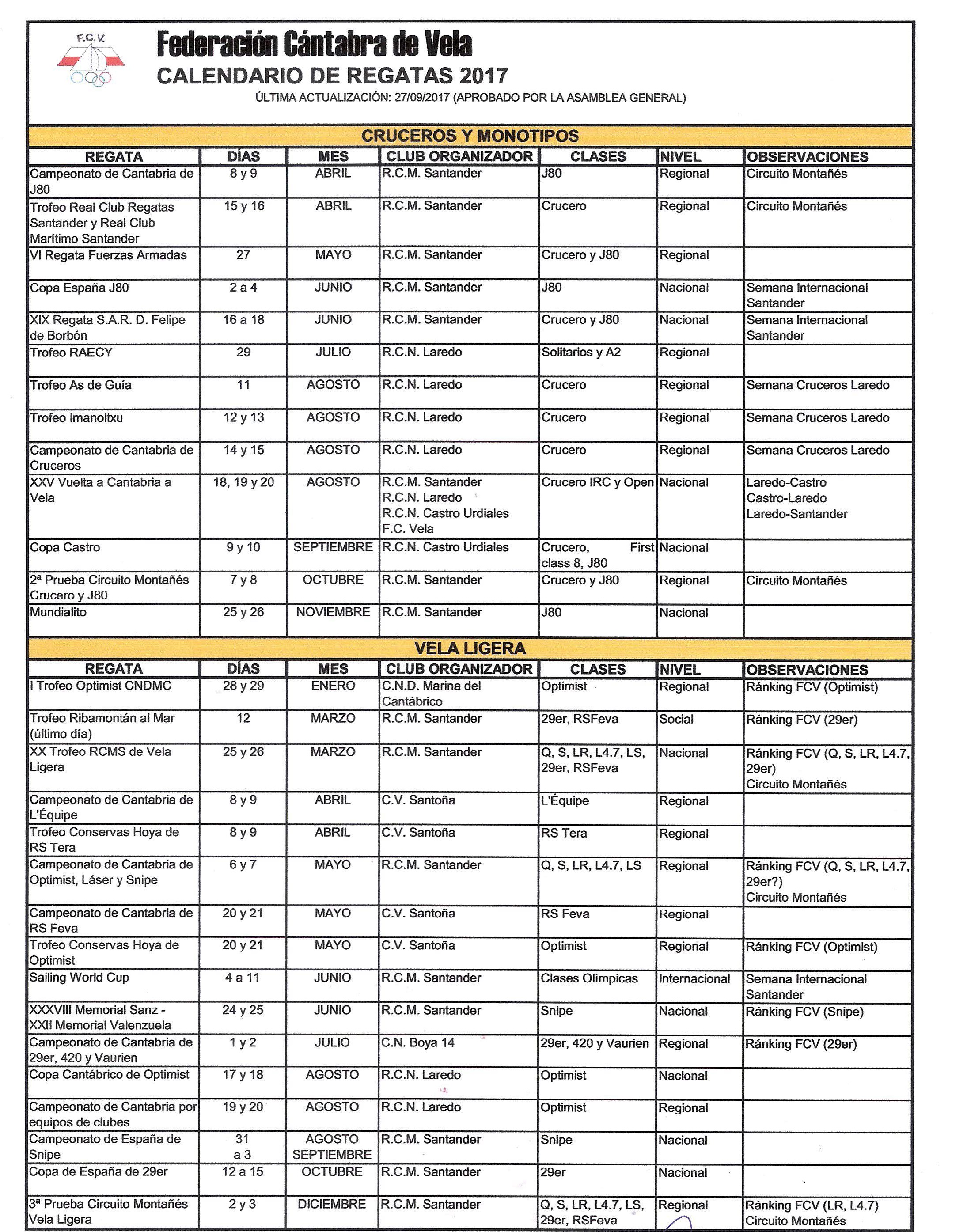 Calendario oficial de regatas de la Federación Cántabra de Vela para el año 2017: