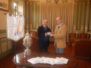 Entrega de la tarjeta con Enrique Cañedo a la izquierda Vicepresidente del RCRS y Fernando Mirapeix a la derecha Presidente de la Federación Cántabra de Vela.