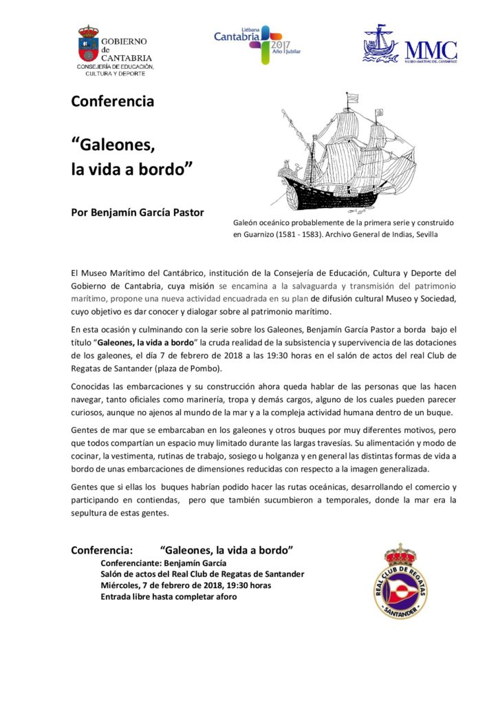 En esta ocasión y culminando con la serie sobre los Galeones, Benjamín García Pastor a borda bajo el título “Galeones, la vida a bordo” la cruda realidad de la subsistencia y supervivencia de las dotaciones de los galeones, el día 7 de febrero de 2018 a las 19:30 horas en el salón de actos del real Club de Regatas de Santander (plaza de Pombo).