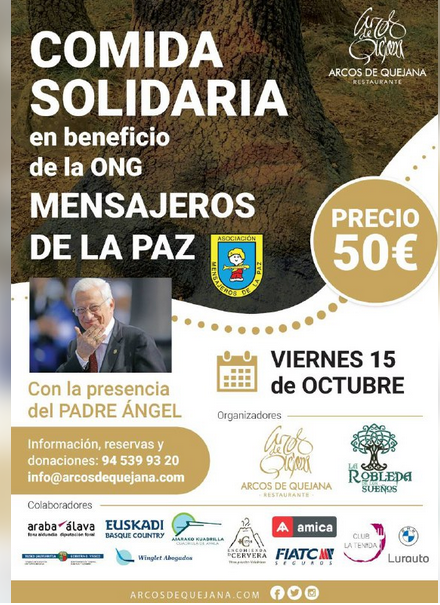El Padre Ángel visitará el País Vasco el próximo 15/10 para participar en un evento solidario en beneficio de la ONG Mensajero de la Paz, Asociación fundada y presidida por él. Dicho evento tendrá lugar a las 13.00 horas en el Restaurante Arcos de Quejana