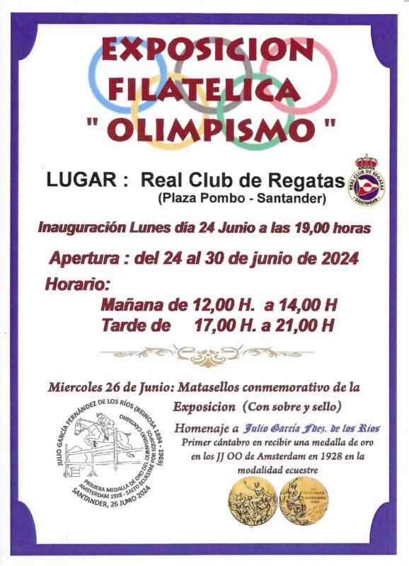 Exposición filatelica “Olimpismo” en el Real Club de Regatas de Santander con iniguración el lunes 24 de junio a las 19h