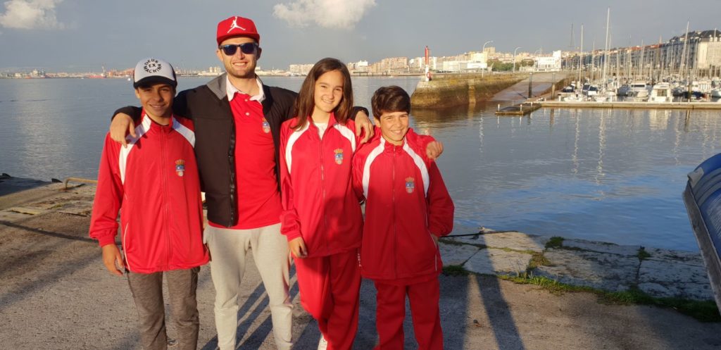 Acompañados de su entrenador Elías Díez, los regatistas de la clase Optimist Beatriz Astorqui, Camilo Felipe y Guillermo Hidalgo salían