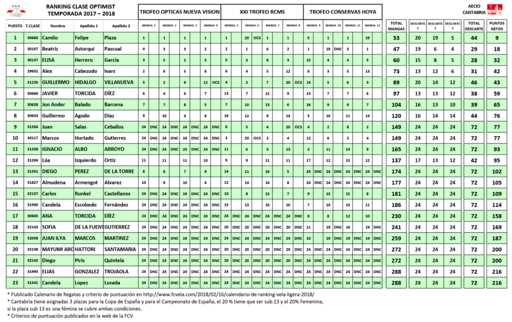 RANKING OPTIMIST A 15 DE ABRIL 2018 Ránking provisional clase Optimist a fecha 15/04/2018